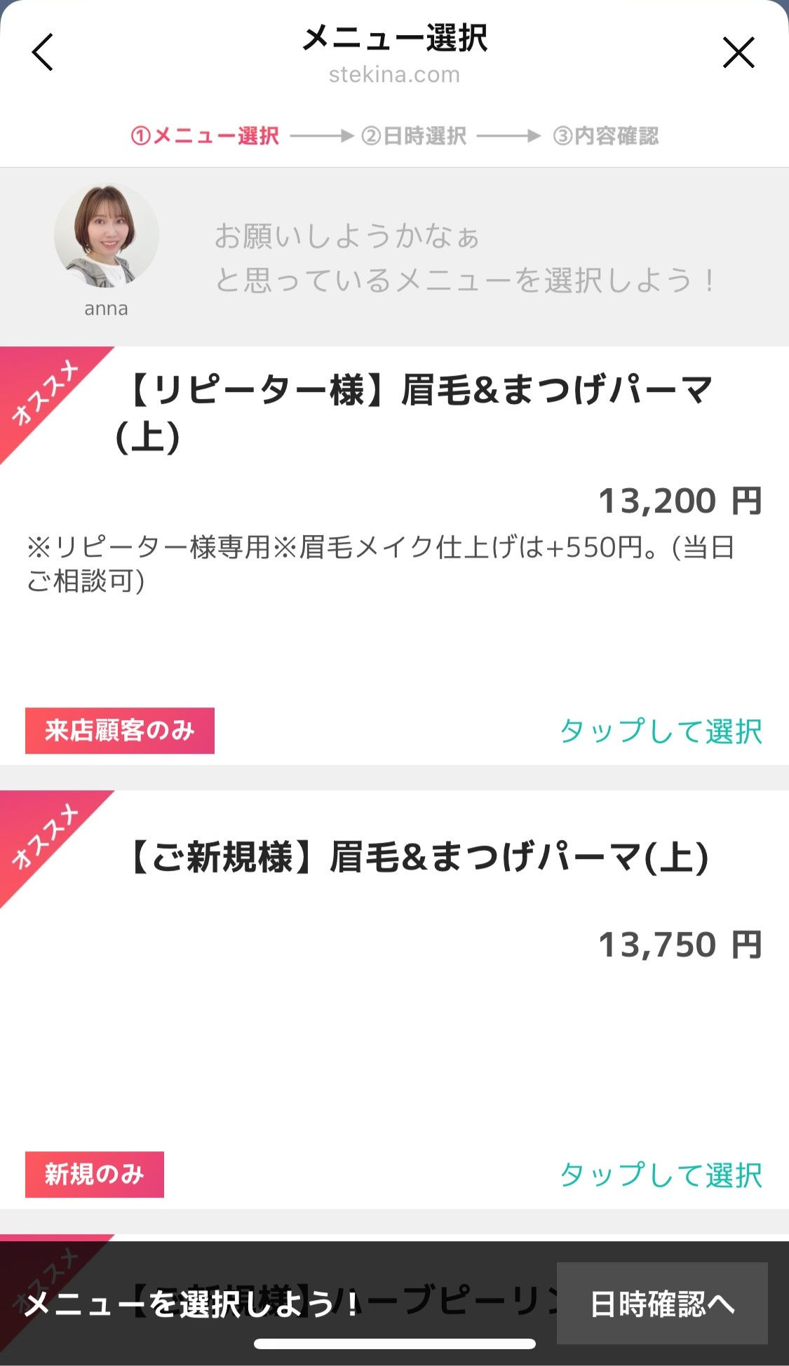 カウンセリング時間をいただきたいので、ご新規様専用メニューをお選びください。